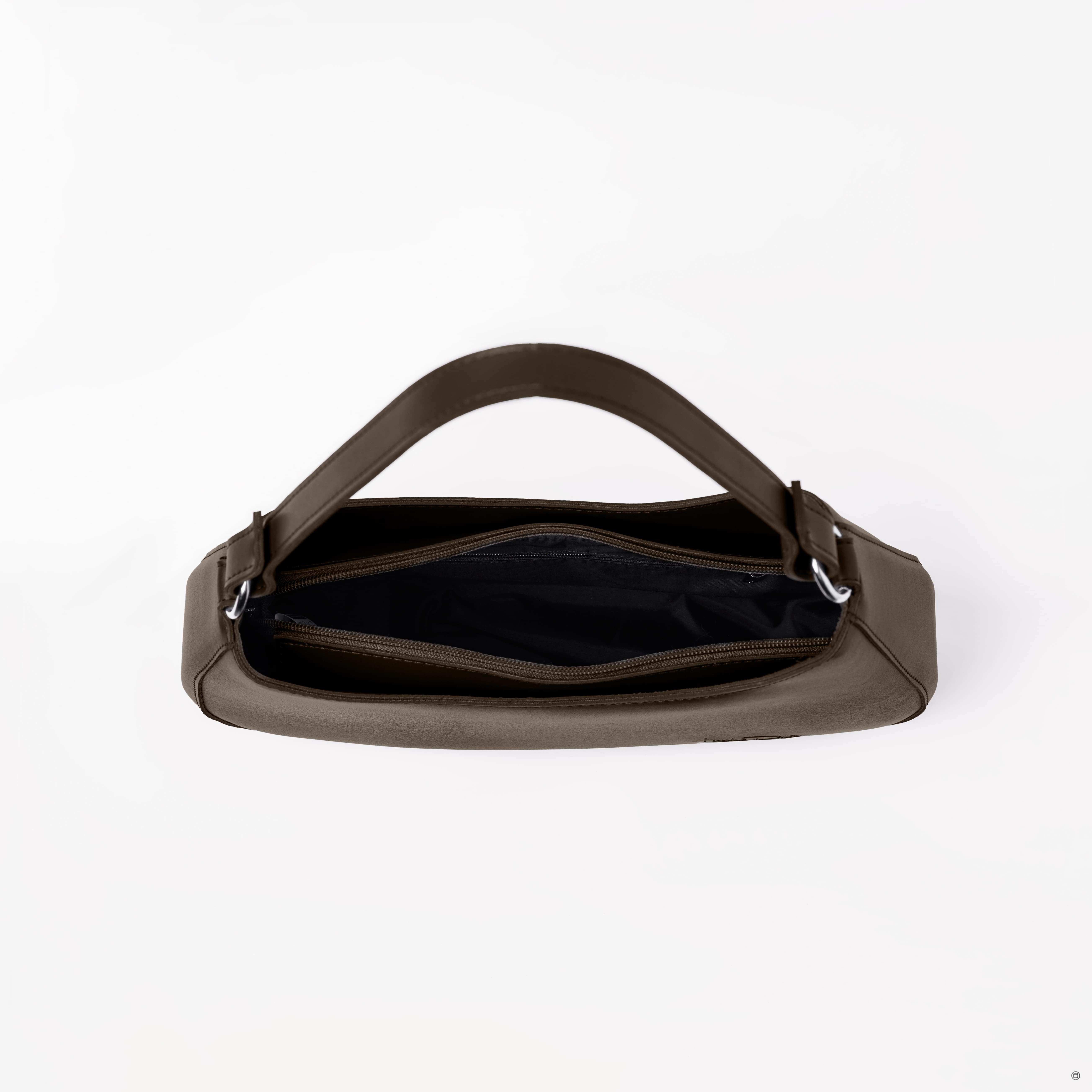 Сумка на одне загальне відділення. Не дивлячись на невеликі розміри, сумочка виявилась достатньо вмісткою. Весь виріб зачиняється на блискавку. Довгий ремінь з можливість регулювання довжини виготовлений з шкірзаміннику. На задній стінці вмонтована кишеня, яка зачиняється на блискавку.