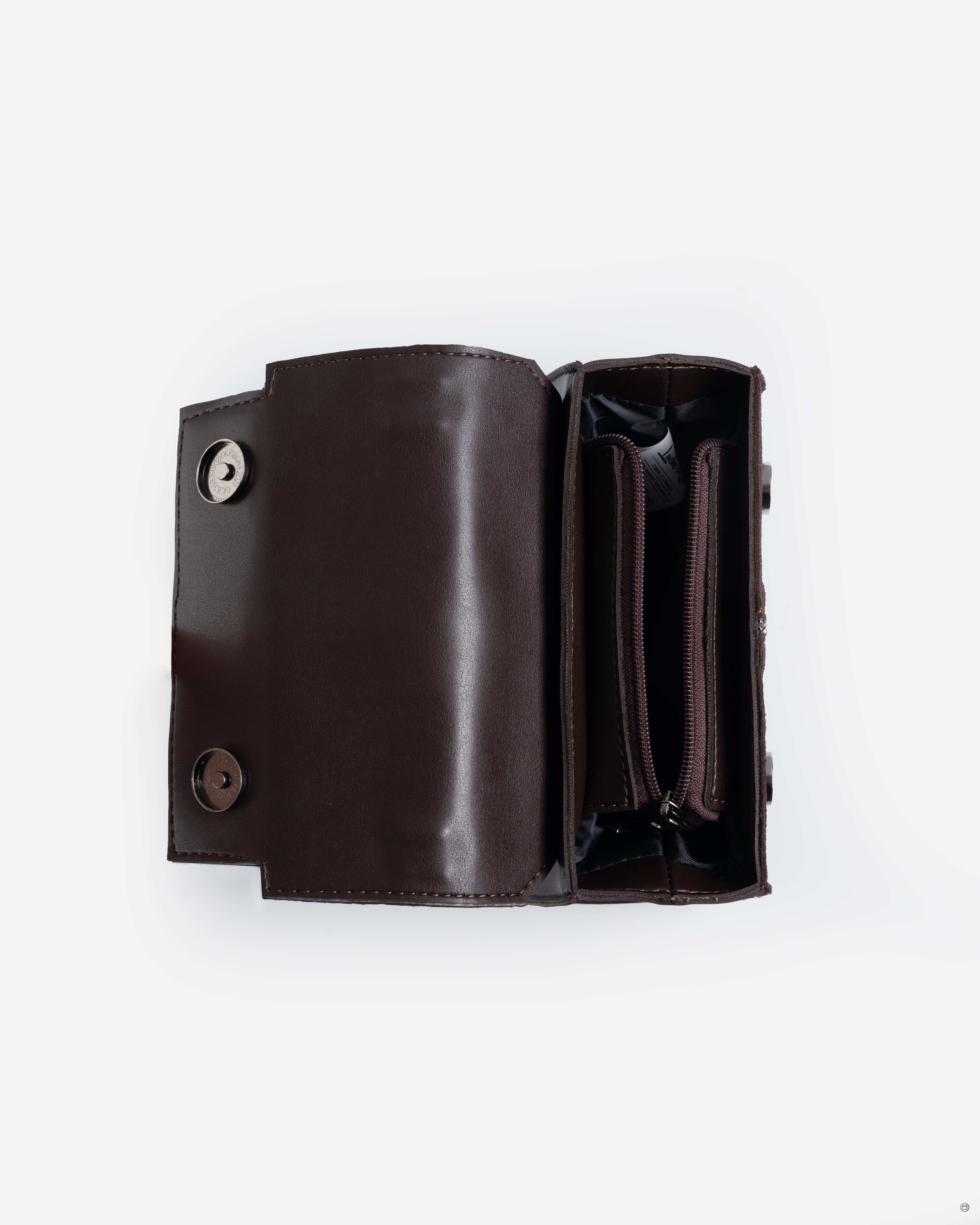 Весь виріб зачиняється на блискавку, яка накривається клапаном на магнітній кнопці. Сумочка має довгий ремінець, який можна відрегулювати під потрібний розмір, для легкого транспортування через плече, та короткий.